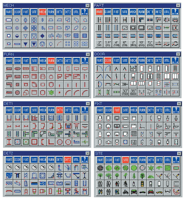 ![]() Okno dialogowe do projektowania schodów programu Architect 2000. ![]() Architect_2000 to pozornie nieskomplikowana nakładka na AutoCAD-a oferująca zaledwie jedno dodatkowe menu z rozwijalnymi paletami. ![]() Okno programu Architect 2000 zarządzające zasobami bibliotecznymi w AutoCAD-zie. |