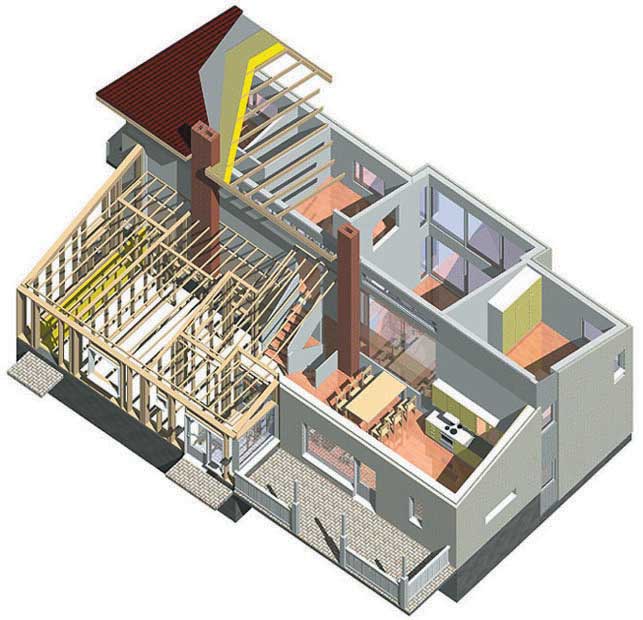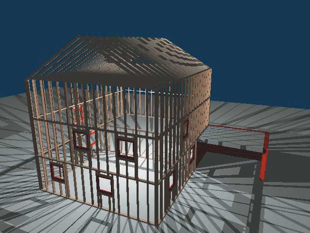 ![]() Wizualizacja budynku z wygenerowaną konstrukcją ścian wykonana za pomocą programu Vertex BD firmy Argos. |